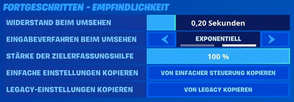 Ist man in den Controller Einstellungen von Fortnite, ist standardmäßig nichts von der Zielerfassungshilfe zu sehen. Diese Option kann man aber leicht einblenden lassen. Um die Option einzublenden, muss man in Fortnite unter Einstellungen -> Controllersteuerung -> Empfindlichkeit die Option fortgeschrittene Optionen verwenden aktivieren.