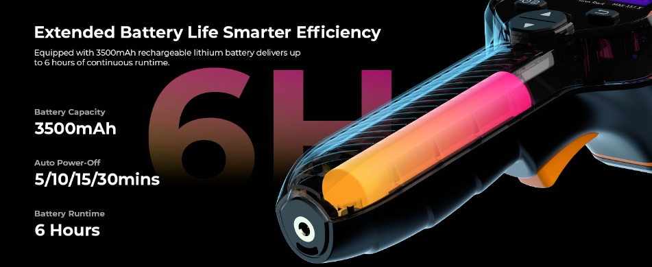 Ein integrierter, wiederaufladbarer 3500-mAh-Lithiumakku ermöglicht bis zu 7 Stunden Dauerbetrieb mit einer Ladung und deckt damit einen gesamten Arbeitstag ab.