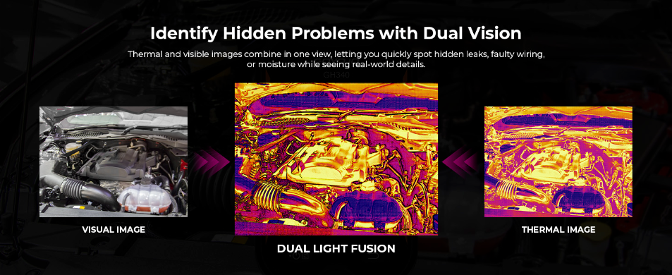 Die GH340 kombiniert Wärmebilddaten in Echtzeit mit dem sichtbaren Kamerabild, sodass Anwender Temperaturanomalien im Kontext der Umgebung sehen können. Diese Fusionsansicht hilft dabei, verborgene Probleme wie Lecks, elektrische Fehler, Isolationslücken oder Feuchtigkeit schnell zu lokalisieren, während die umgebenden Strukturen sichtbar bleiben. Das Ergebnis sind schnellere Identifikation, weniger Rätselraten und verlässlichere Diagnosen.