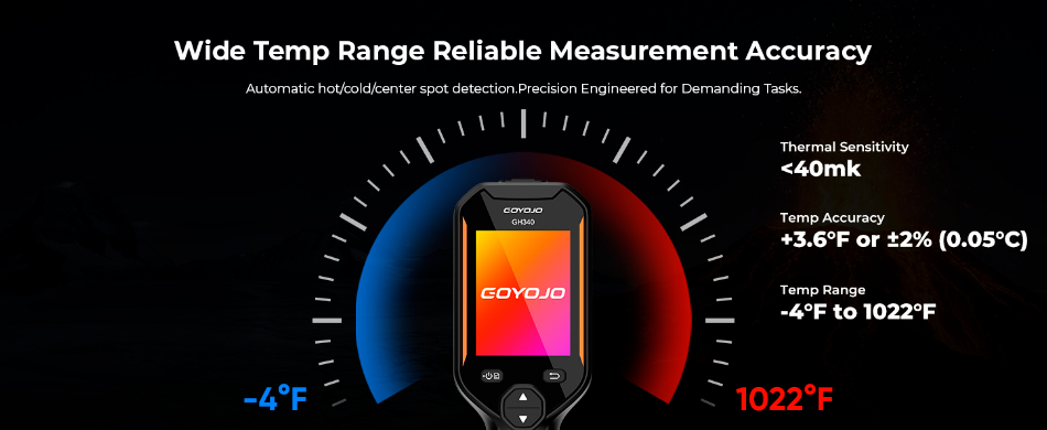 - Präzise Temperaturmessung mit hoher Empfindlichkeit: Messbereich von -4 °F bis 1022 °F (-20 °C bis 550 °C), mit einer Genauigkeit innerhalb einer Fehlertoleranz von ±2 %. Eine thermische Empfindlichkeit von <40 mK erfasst selbst kleinste Temperaturunterschiede.