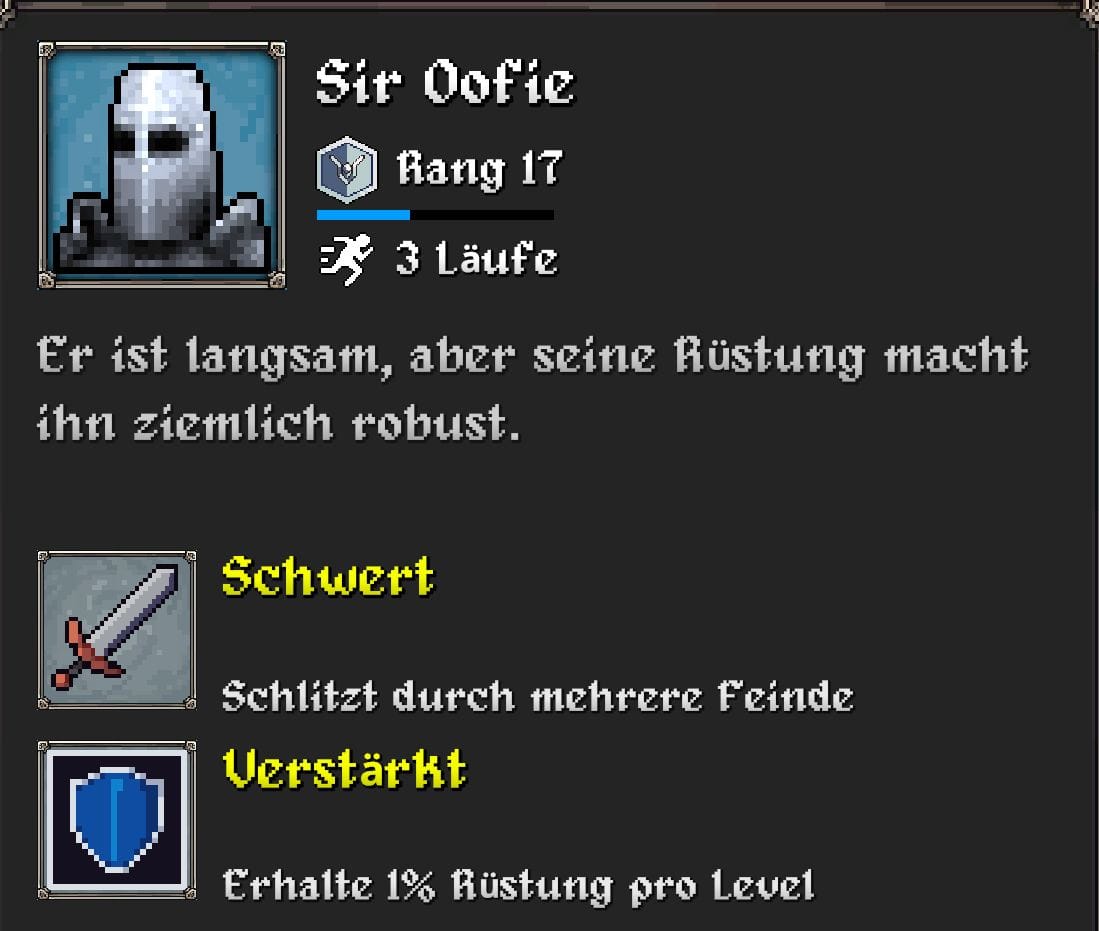 Sir Oofie startet mit einem Schwert, das guten Flächenschaden verursacht, allerdings zu Beginn nur geringe Reichweite hat.