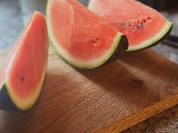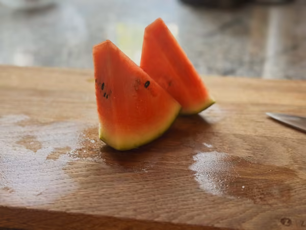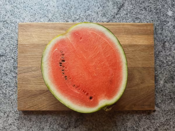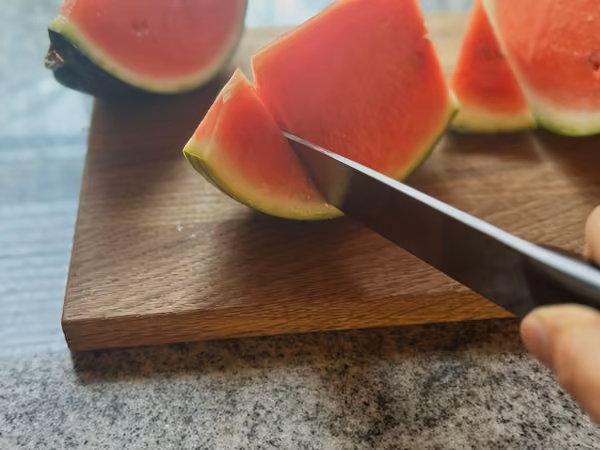 Bevor ich eine Melone aufschneide, wasche ich sie gründlich ab. Dabei benutze ich meistens eine Bürste und einen kleinen Tropfen Spülmittel. Keine Sorge, das Spülmittel wird man nicht schmecken. Auf diese Weise vermeide ich jedoch, dass mögliche Darmbakterien, die sich gerne auf der Melonenschale ansiedeln, auf das Fruchtfleisch gelangen.