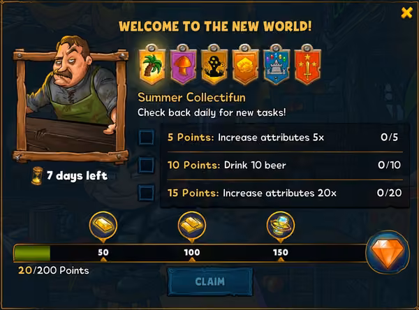 Die Aufgaben sind zum Beispiel, ein Attribut 5x zu skillen, 10 Bier zu trinken, oder die Pets 8x zu füttern. Für jede Aufgabe erhältst du Punkte, abhängig davon, wie schwer sie ist. Den großen Gewinn erhältst du für 200 gesammelte Punkte: einen orangenen Edelstein.